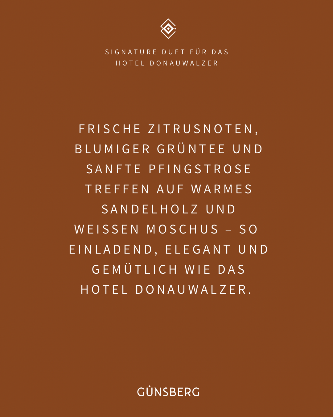 Das Boutique Hotel Donauwalzer steht für Wiener Gastlichkeit, gepaart mit urbanem Lifestyle. Ziel war es, einen Duft zu kreieren, der die Einzigartigkeit des Hauses transportiert und den Gästen bereits beim Eintreten ein Gefühl von Willkommensein schenkt