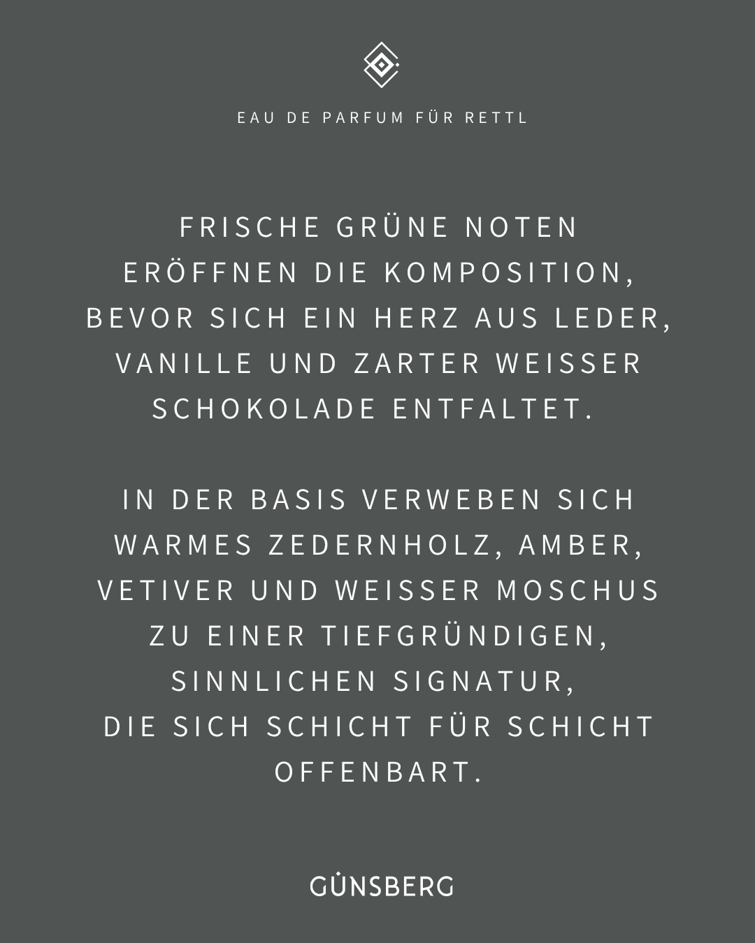 Entwickelt in Zusammenarbeit mit Günsberg Creation, bringt der Duft die Seele des Hauses in eine neue Dimension – unverwechselbar, markant und tief verwurzelt in der Tradition feiner Handarbeit.