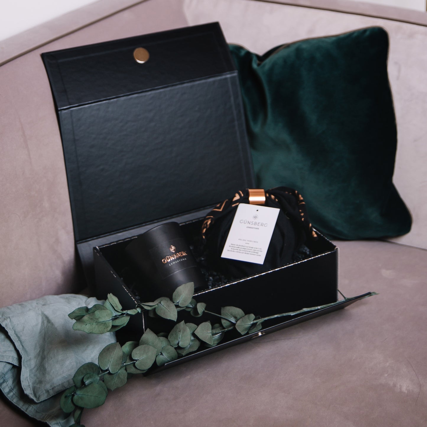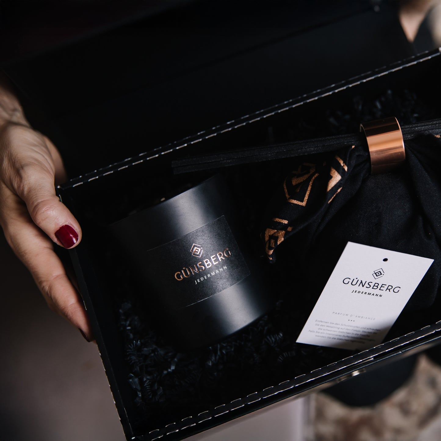Diese Box beinhaltet unser Jedermann Parfum d‘Ambiance inkl. Tuch | 100 ml und unsere Jedermann Kerze inkl. Tuch | 200 g.
